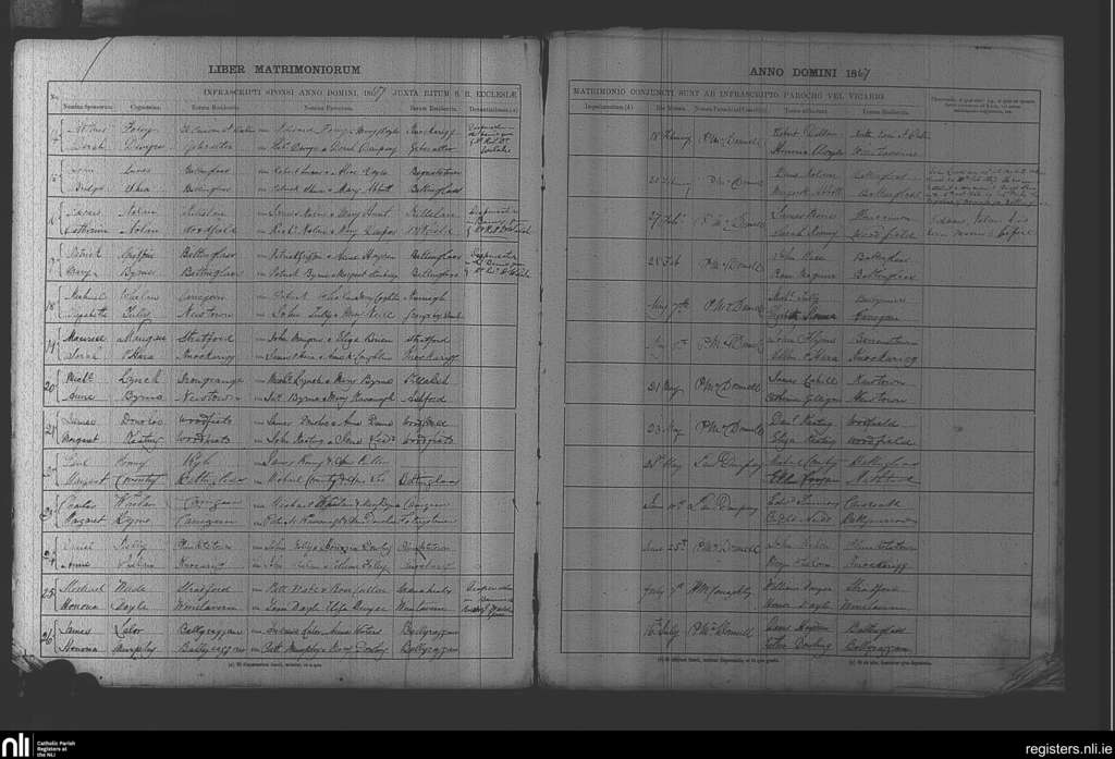 Baltinglass; County of Kildare, Wicklow; Diocese of Kildare and Leighlin. Marriages, Feb. 1867 to July 1867