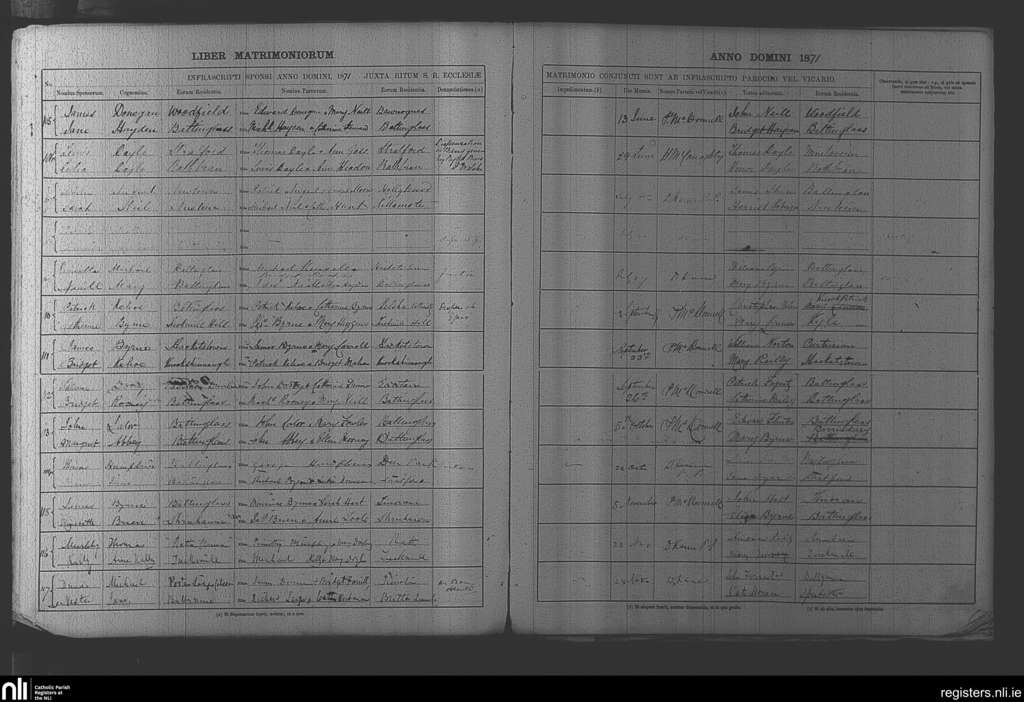 Baltinglass; County of Kildare, Wicklow; Diocese of Kildare and Leighlin. Marriages, June 1871 to Nov. 1871