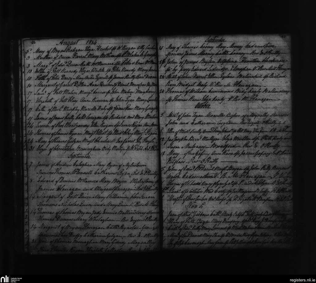 Balyna; County of Kildare; Diocese of Kildare and Leighlin. Baptisms, Aug. 1834 to Nov. 1834