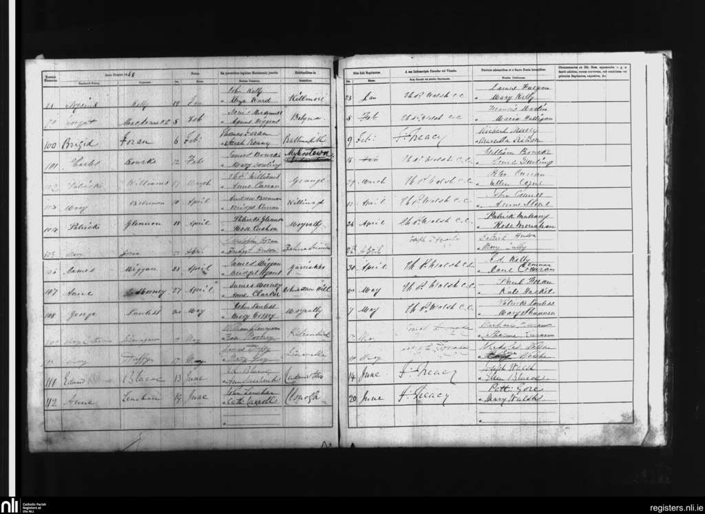 Balyna; County of Kildare; Diocese of Kildare and Leighlin. Baptisms, Jan. 1868 to June 1868