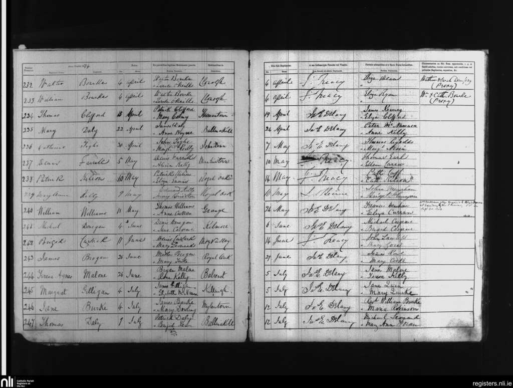 Balyna; County of Kildare; Diocese of Kildare and Leighlin. Baptisms, Apr. 1874 to July 1874