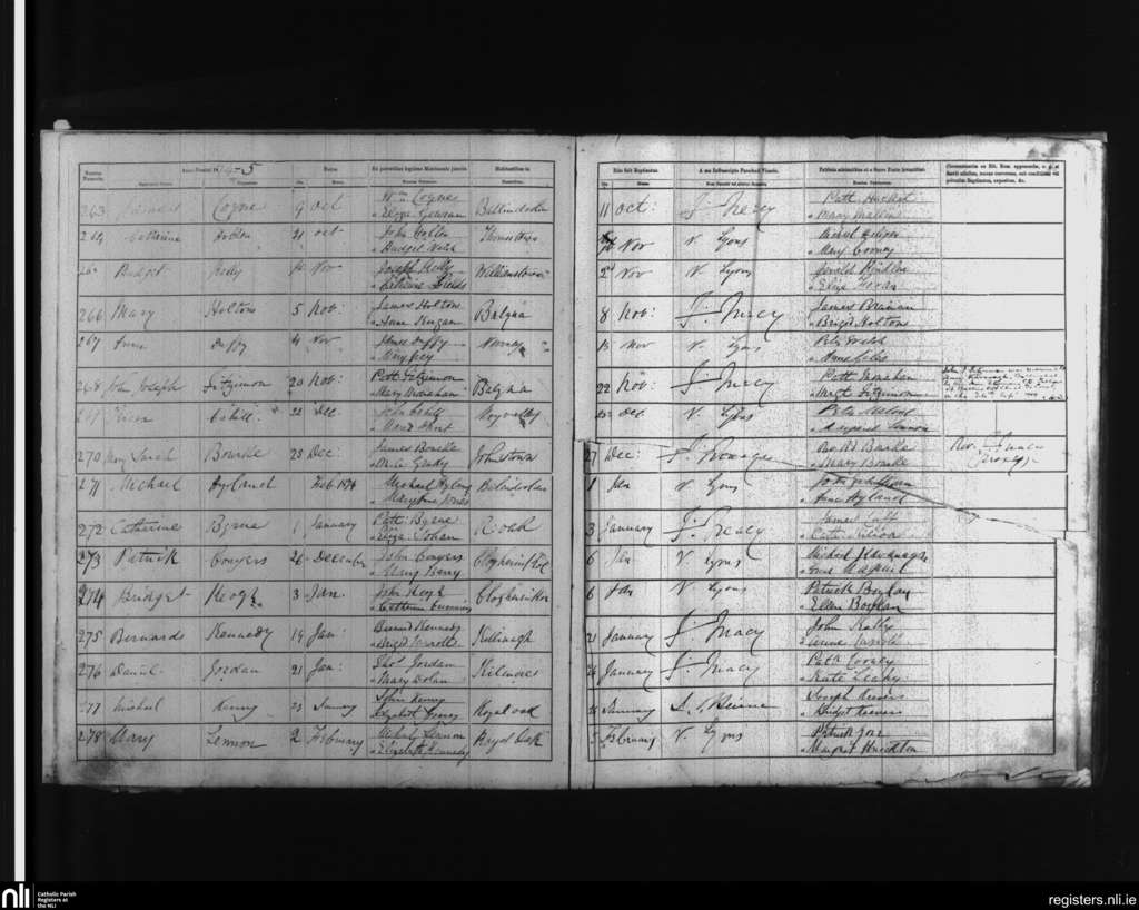 Balyna; County of Kildare; Diocese of Kildare and Leighlin. Baptisms, Oct. 1874 to Feb. 1875