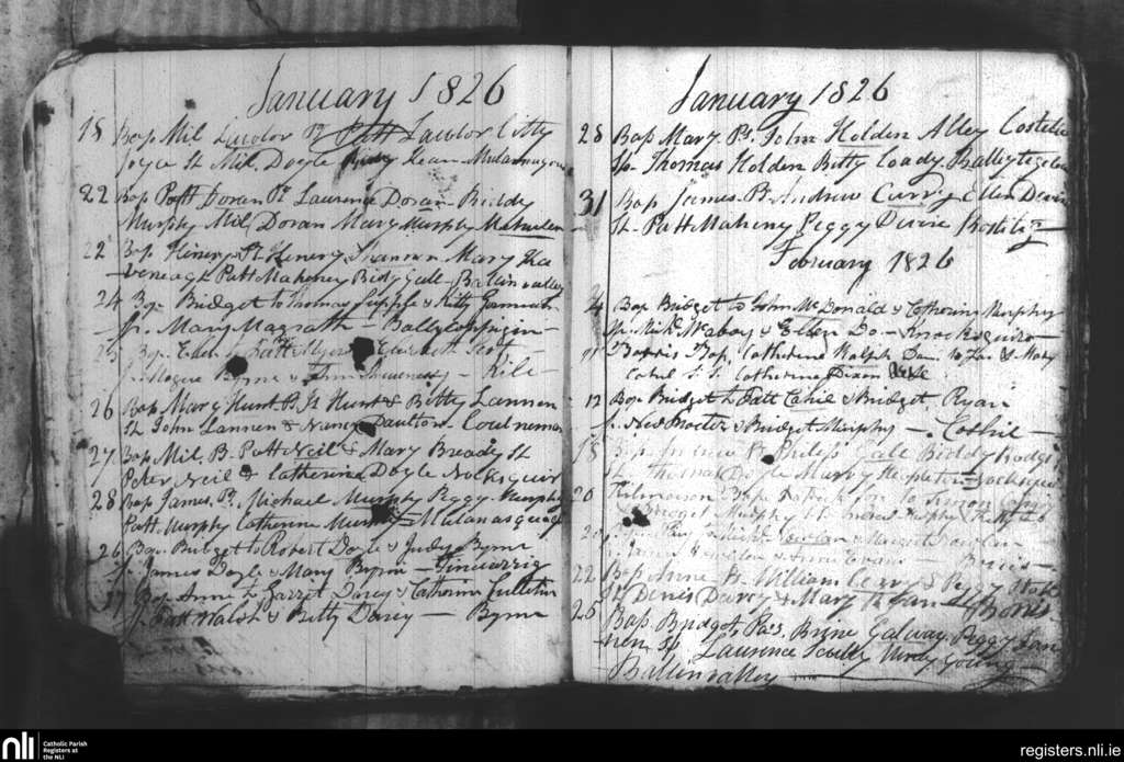 Borris; County of Wexford, Carlow; Diocese of Kildare and Leighlin. Baptisms, Jan. 1826 to Feb. 1826
