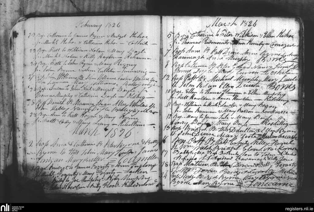 Borris; County of Wexford, Carlow; Diocese of Kildare and Leighlin. Baptisms, Feb. 1826 to Mar. 1826