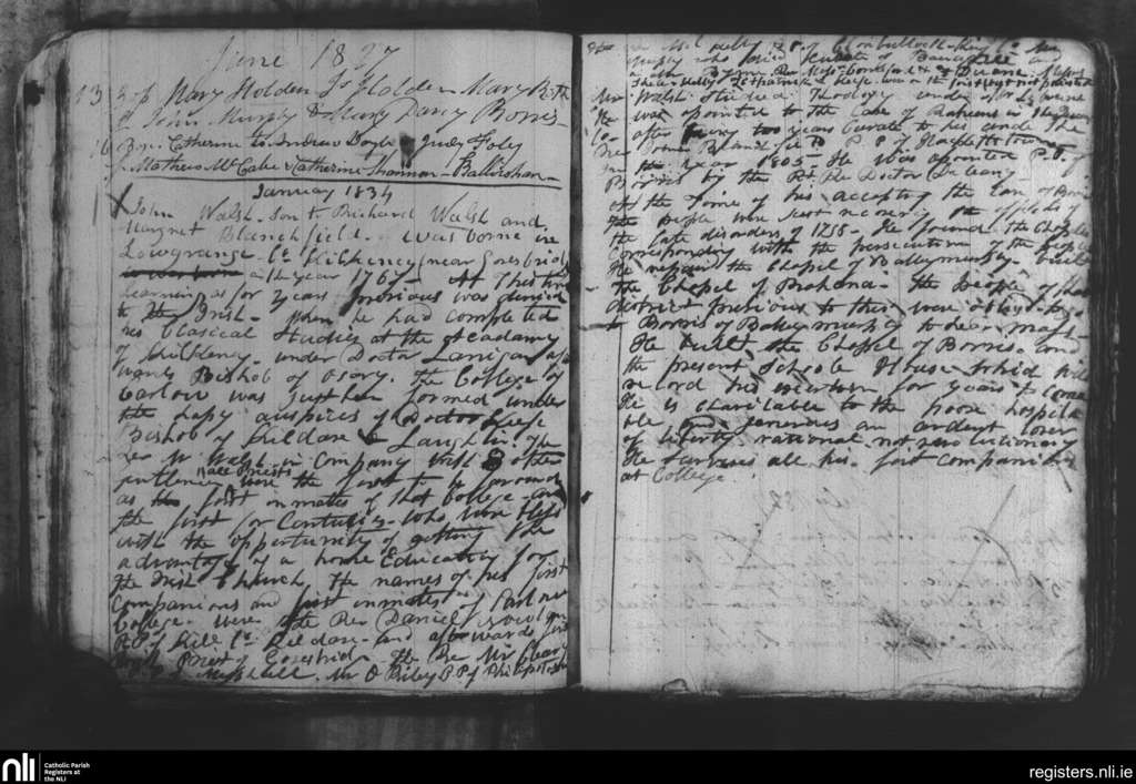 Borris; County of Wexford, Carlow; Diocese of Kildare and Leighlin. Baptisms, June 1827 to Jan. 1834