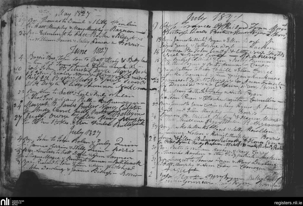 Borris; County of Wexford, Carlow; Diocese of Kildare and Leighlin. Baptisms, May 1827 to Aug. 1827