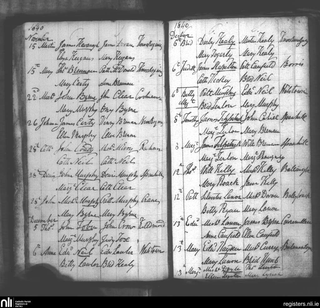 Borris; County of Wexford, Carlow; Diocese of Kildare and Leighlin. Baptisms, Nov. 1840 to Dec. 1840