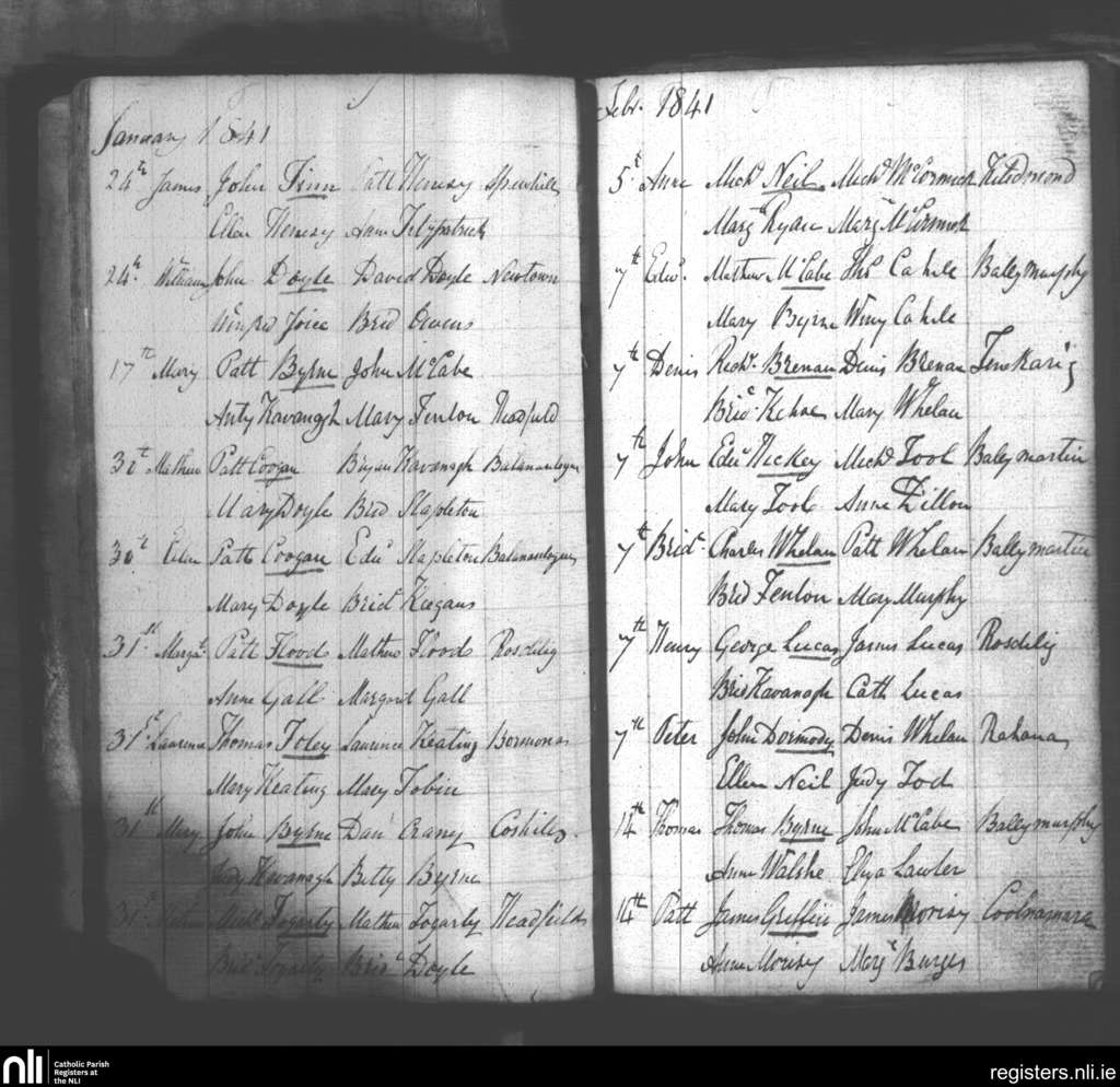 Borris; County of Wexford, Carlow; Diocese of Kildare and Leighlin. Baptisms, Jan. 1841 to Feb. 1841