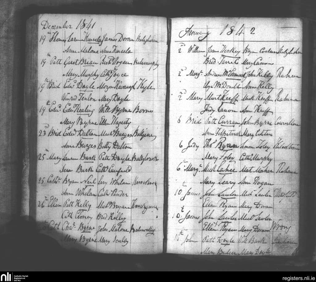 Borris; County of Wexford, Carlow; Diocese of Kildare and Leighlin. Baptisms, Dec. 1841 to Jan. 1842