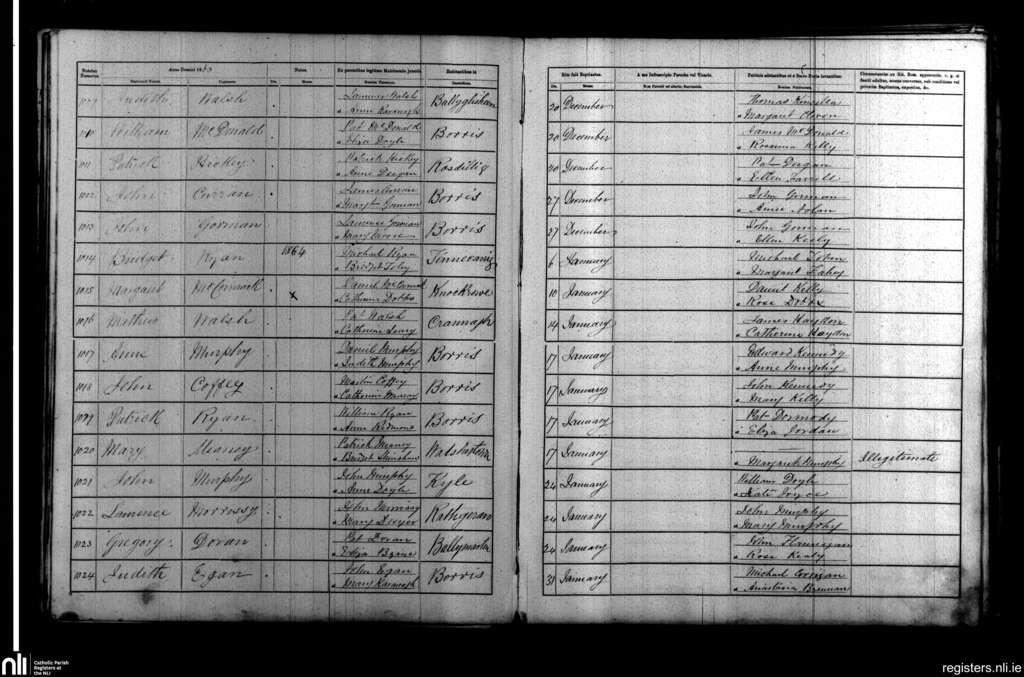 Borris; County of Carlow, Wexford; Diocese of Kildare and Leighlin. Baptisms, Dec. 1863 to Jan. 1864