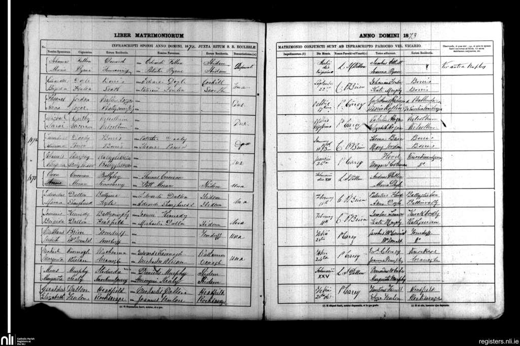 Borris; County of Carlow, Wexford; Diocese of Kildare and Leighlin. Marriages, July 1872 to Feb. 1873