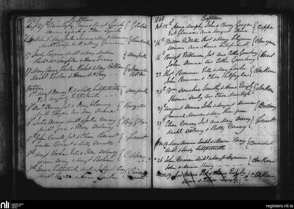 Cappinrush; County of Laois; Diocese of Kildare and Leighlin. Baptisms, Aug. 1848 to Dec. 1848