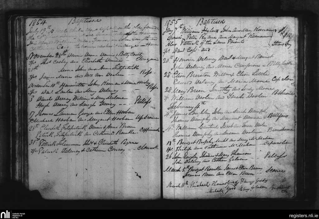 Cappinrush; County of Laois; Diocese of Kildare and Leighlin. Baptisms, July 1854 to Mar. 1855