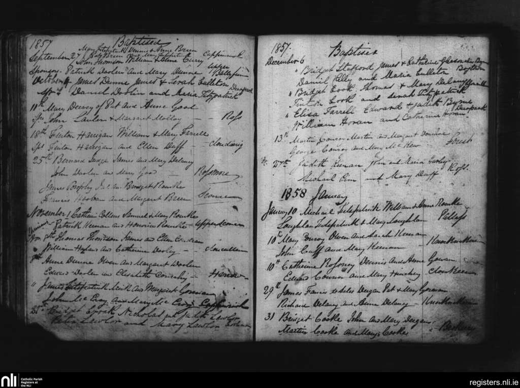 Cappinrush; County of Laois; Diocese of Kildare and Leighlin. Baptisms, Sep. 1857 to Jan. 1858
