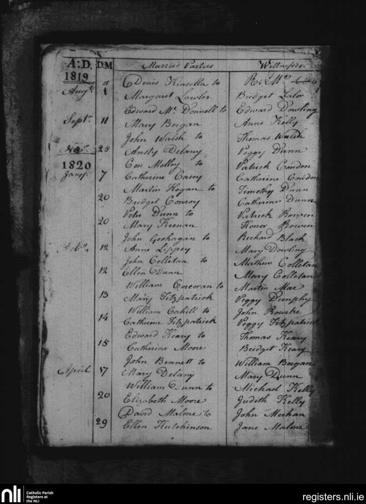 Cappinrush; County of Laois; Diocese of Kildare and Leighlin. Marriages, Aug. 1819 to Apr. 1820