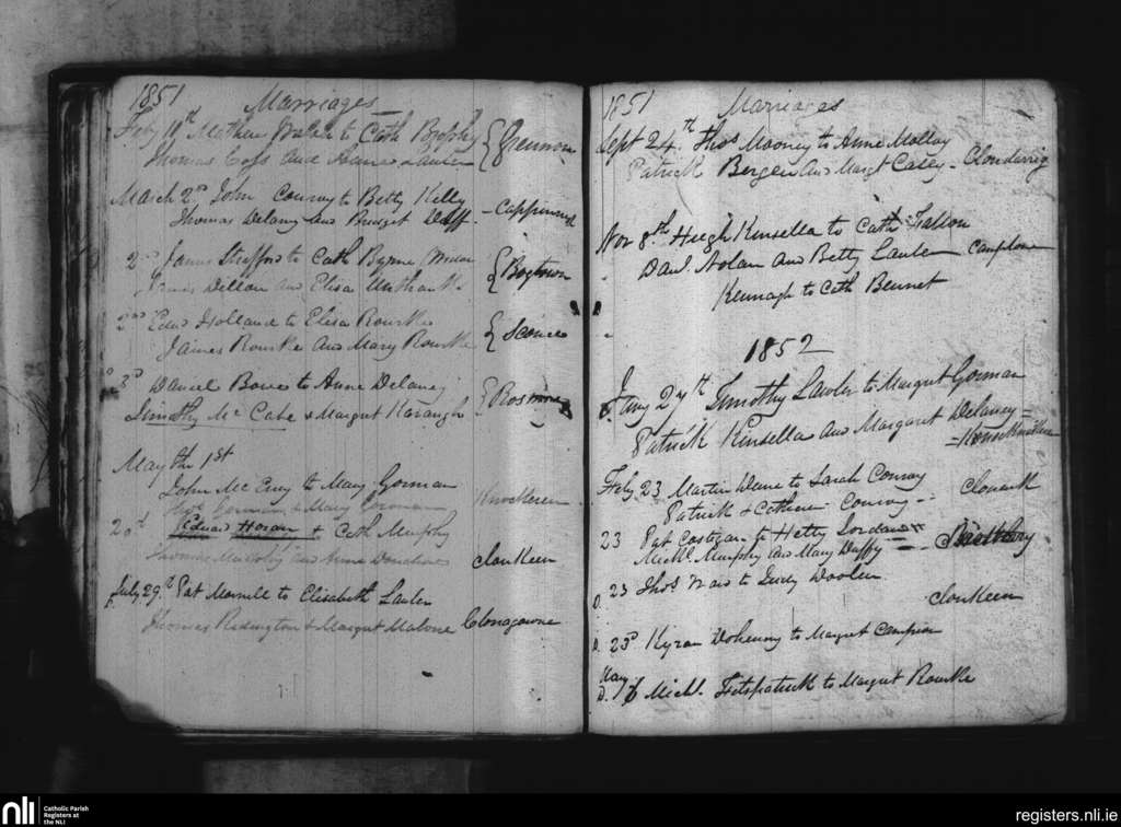 Cappinrush; County of Laois; Diocese of Kildare and Leighlin. Marriages, Feb. 1851 to May 1852