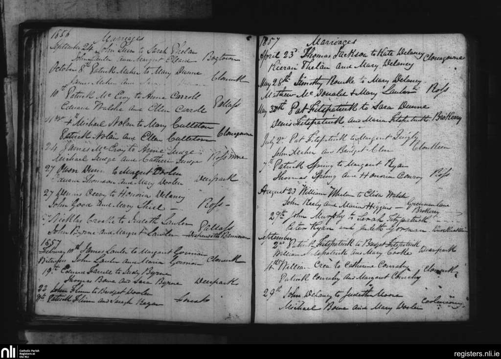 Cappinrush; County of Laois; Diocese of Kildare and Leighlin. Marriages, Sep. 1856 to Sep. 1857
