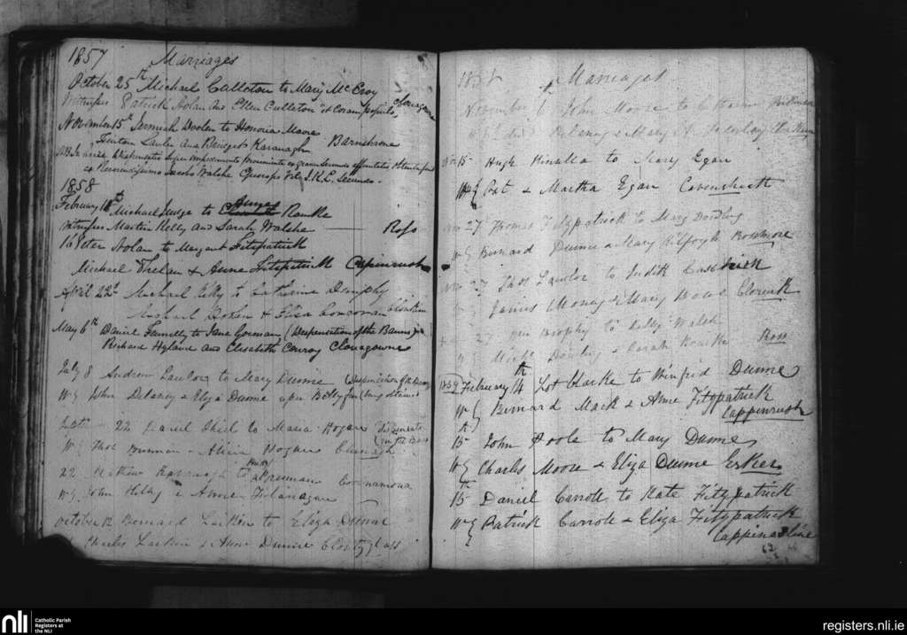 Cappinrush; County of Laois; Diocese of Kildare and Leighlin. Marriages, Oct. 1857 to Feb. 1859