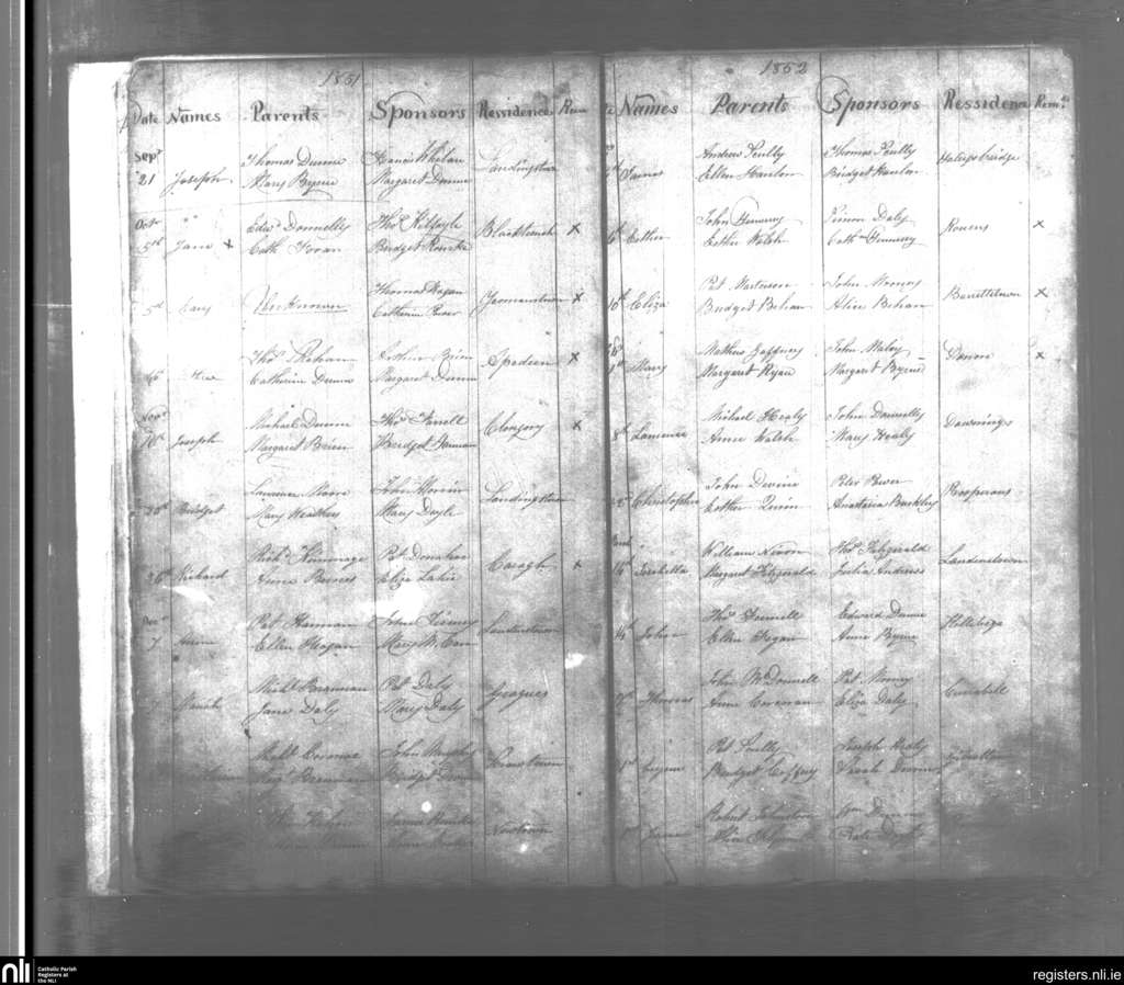 Caragh; County of Kildare; Diocese of Kildare and Leighlin. Baptisms, Sep. 1851 to Mar. 1852