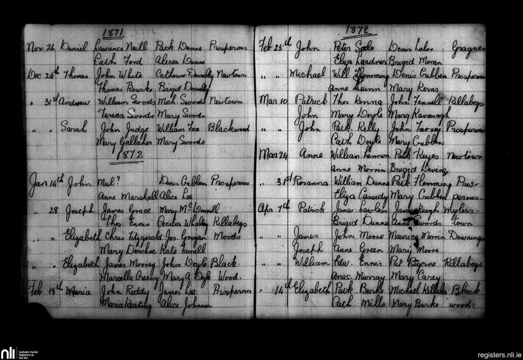 Caragh; County of Kildare; Diocese of Kildare and Leighlin. Baptisms, Nov. 1871 to Apr. 1872