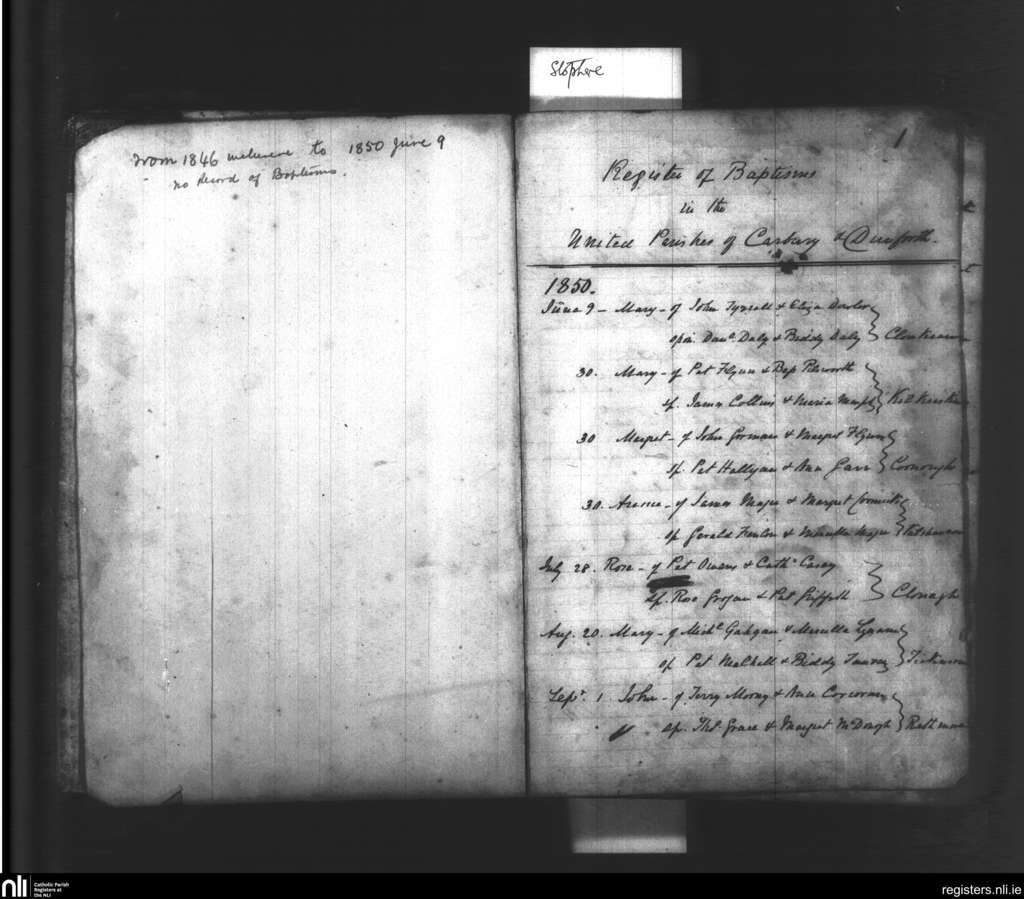 Carbury and Dunforth; County of Kildare; Diocese of Kildare and Leighlin. Baptisms, June 1850 to Sep. 1850