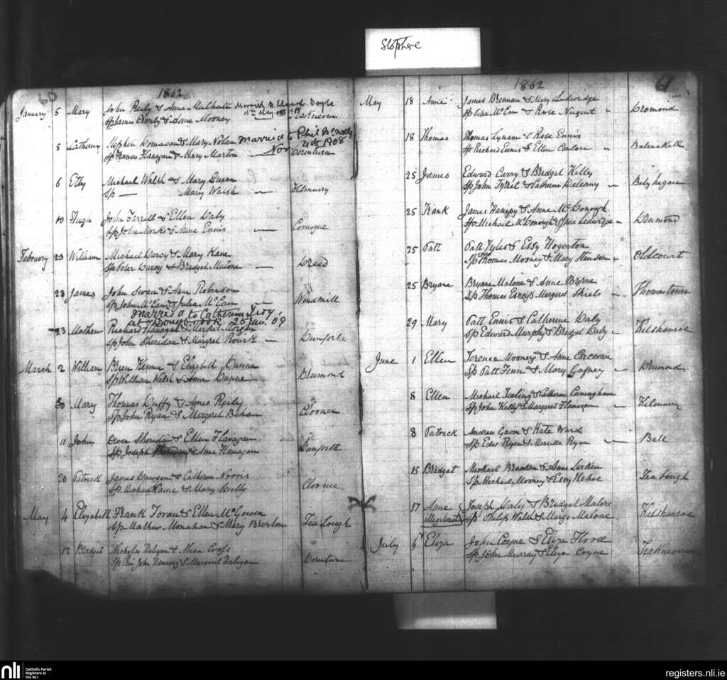 Carbury and Dunforth; County of Kildare; Diocese of Kildare and Leighlin. Baptisms, Jan. 1862 to July 1862