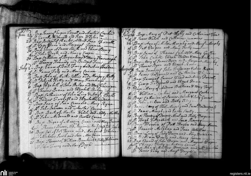 Carlow; County of Carlow, Kildare; Diocese of Kildare and Leighlin. Baptisms, June 1775 to Aug. 1775