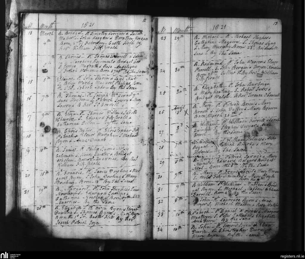 Carlow; County of Carlow, Kildare; Diocese of Kildare and Leighlin. Baptisms, Mar. 1821 to Apr. 1821