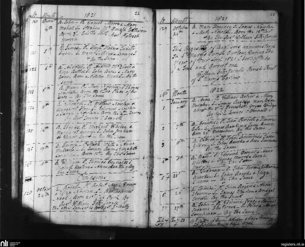 Carlow; County of Carlow, Kildare; Diocese of Kildare and Leighlin. Baptisms, Oct. 1821 to Feb. 1822
