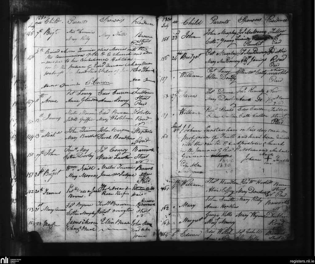 Carlow; County of Carlow, Kildare; Diocese of Kildare and Leighlin. Baptisms, July 1830 to Aug. 1830