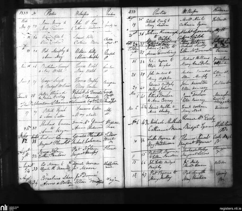 Carlow; County of Carlow, Kildare; Diocese of Kildare and Leighlin. Marriages, May 1833 to Nov. 1833