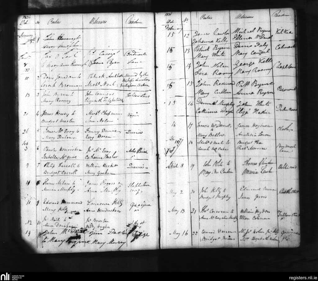Carlow; County of Carlow, Kildare; Diocese of Kildare and Leighlin. Marriages, Jan. 1836 to May 1836