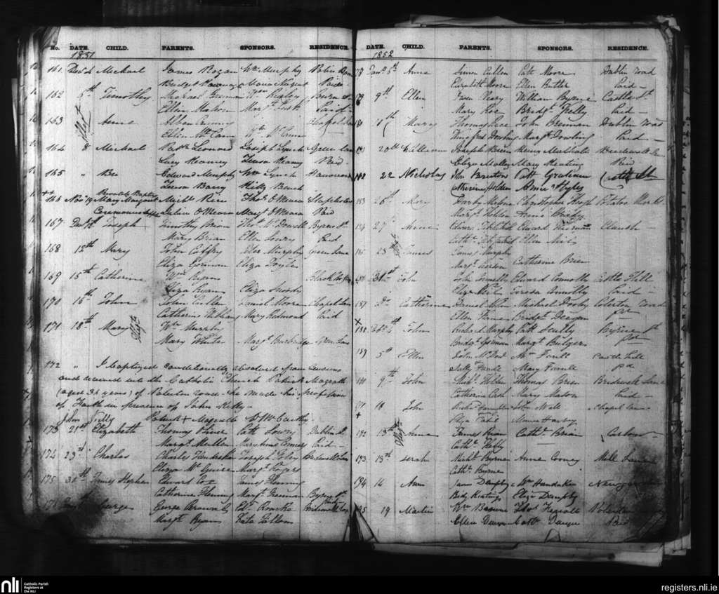Carlow; County of Kildare, Carlow; Diocese of Kildare and Leighlin. Baptisms, Dec. 1851 to Jan. 1852