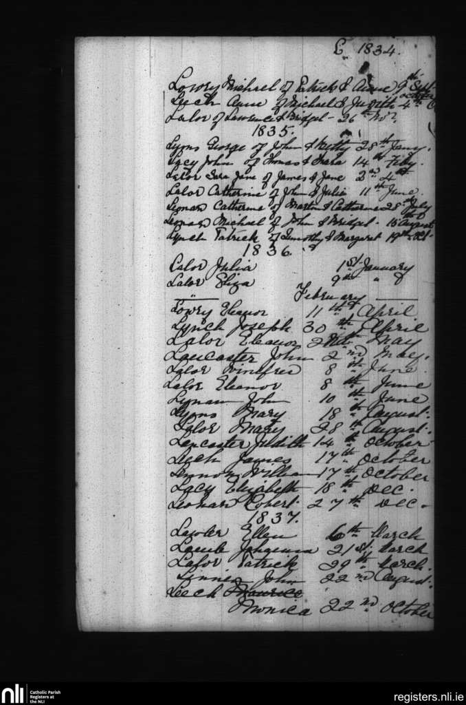 Carlow; County of Kildare, Carlow; Diocese of Kildare and Leighlin. Baptisms, Sep. 1834 to Oct. 1837