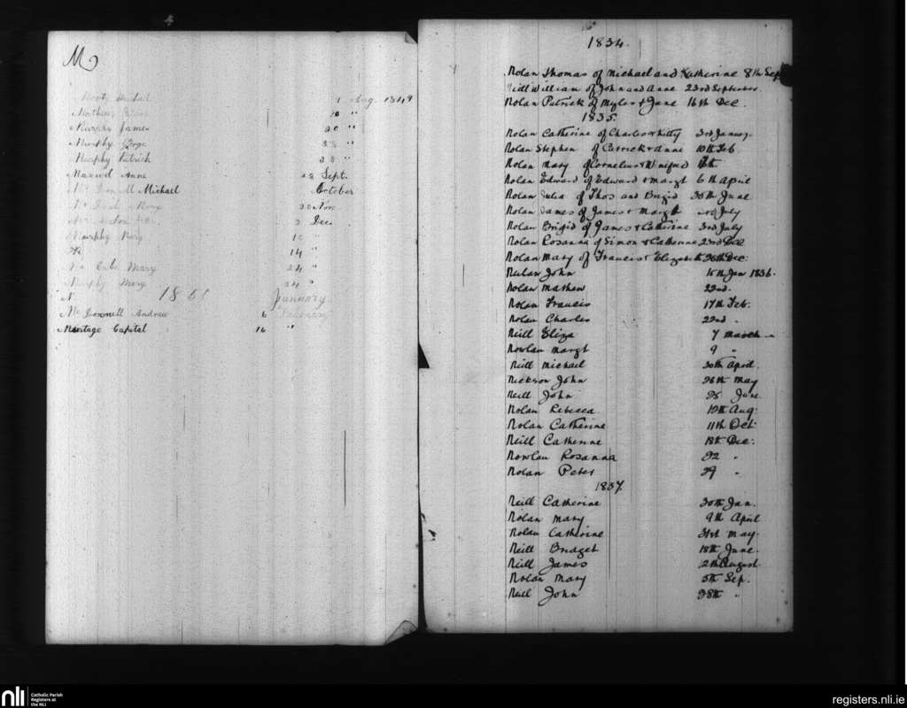 Carlow; County of Kildare, Carlow; Diocese of Kildare and Leighlin. Baptisms, Sep. 1834 to Jan. 1850