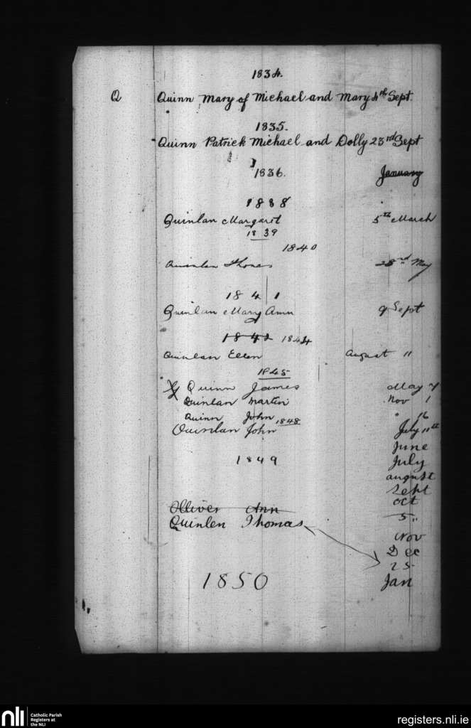 Carlow; County of Kildare, Carlow; Diocese of Kildare and Leighlin. Baptisms, Sep. 1834 to Jan. 1850