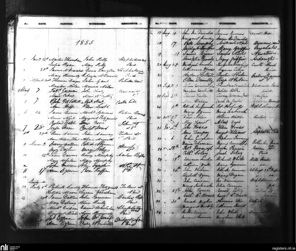 Carlow; County of Carlow, Kildare; Diocese of Kildare and Leighlin. Marriages, Jan. 1855 to Nov. 1855