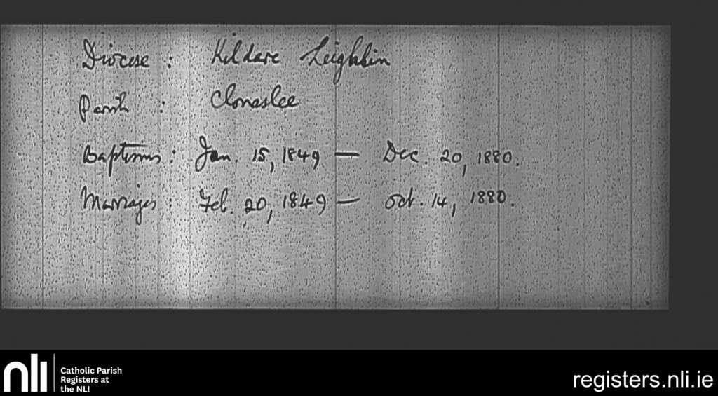 Clonaslee; County of Laois; Diocese of Kildare and Leighlin. Baptisms, Marriages