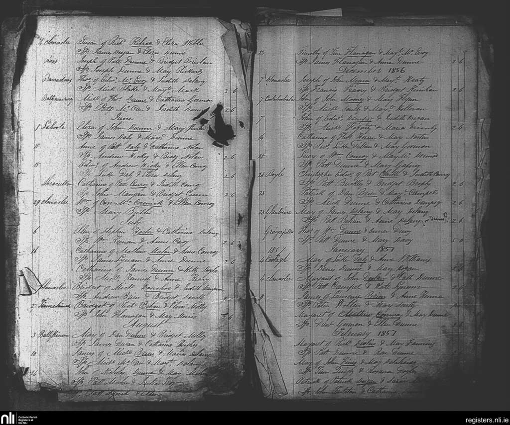 Clonaslee; County of Laois; Diocese of Kildare and Leighlin. Baptisms, May 1856 to Feb. 1857