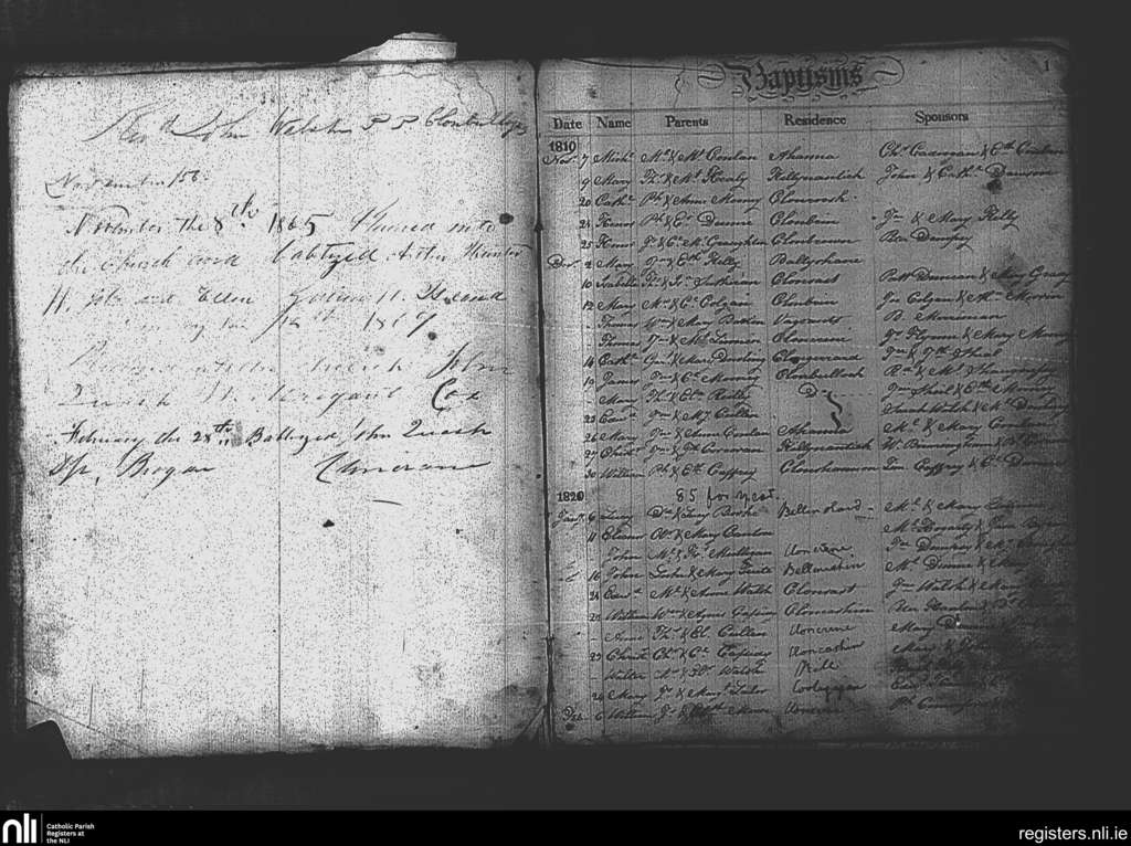 Clonbulloge; County of Offaly, Kildare; Diocese of Kildare and Leighlin. Baptisms, Nov. 1810 to Feb. 1820