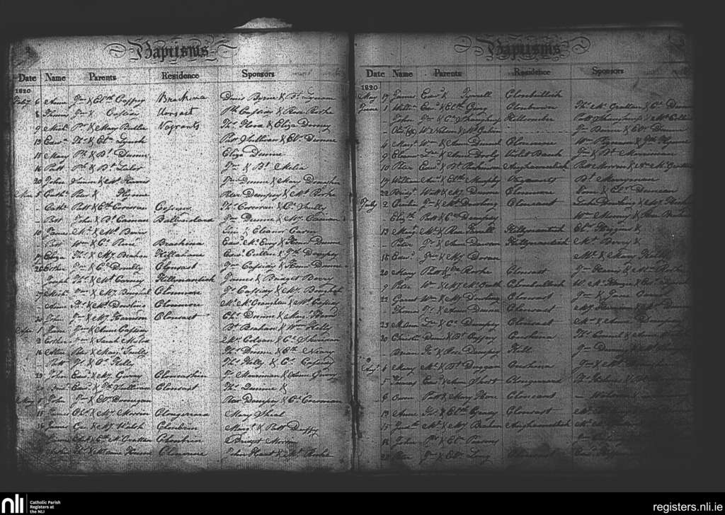 Clonbulloge; County of Offaly, Kildare; Diocese of Kildare and Leighlin. Baptisms, Feb. 1820 to Aug. 1820
