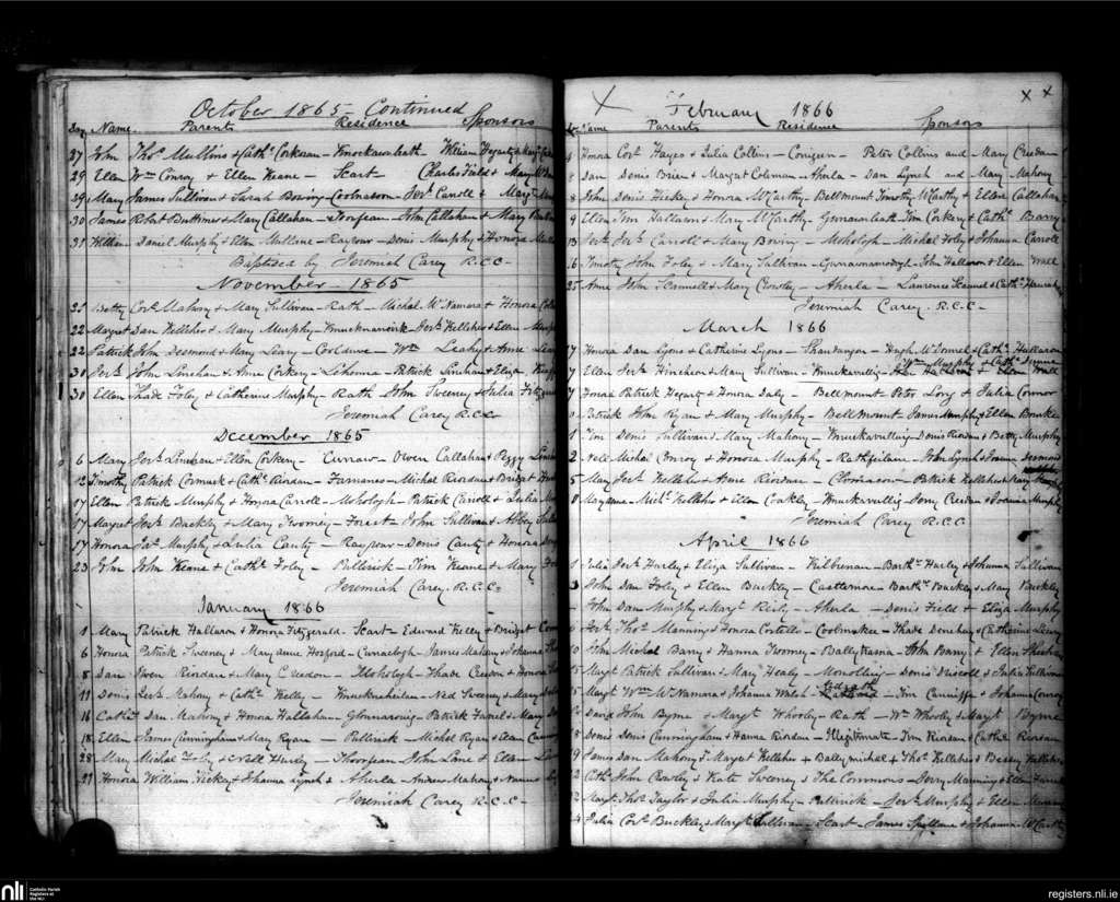 Kilmurry; County of Cork; Diocese of Cork and Ross. Baptisms, Oct. 1865 to Apr. 1866