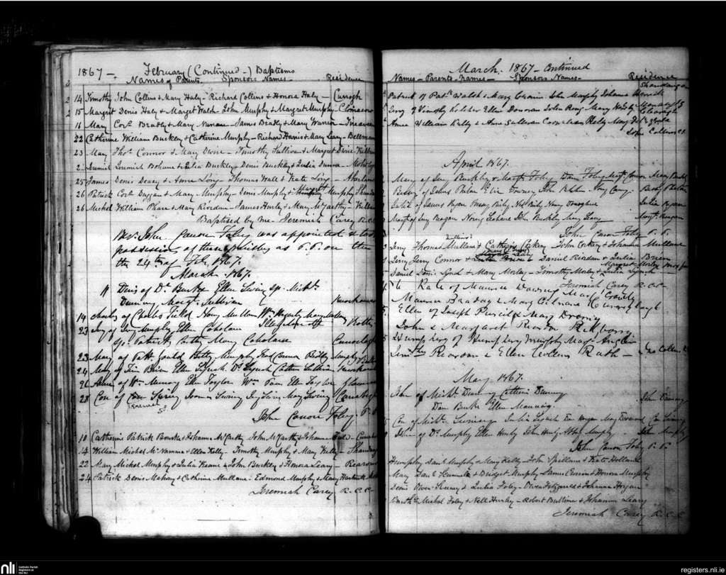 Kilmurry; County of Cork; Diocese of Cork and Ross. Baptisms, Feb. 1867 to May 1867