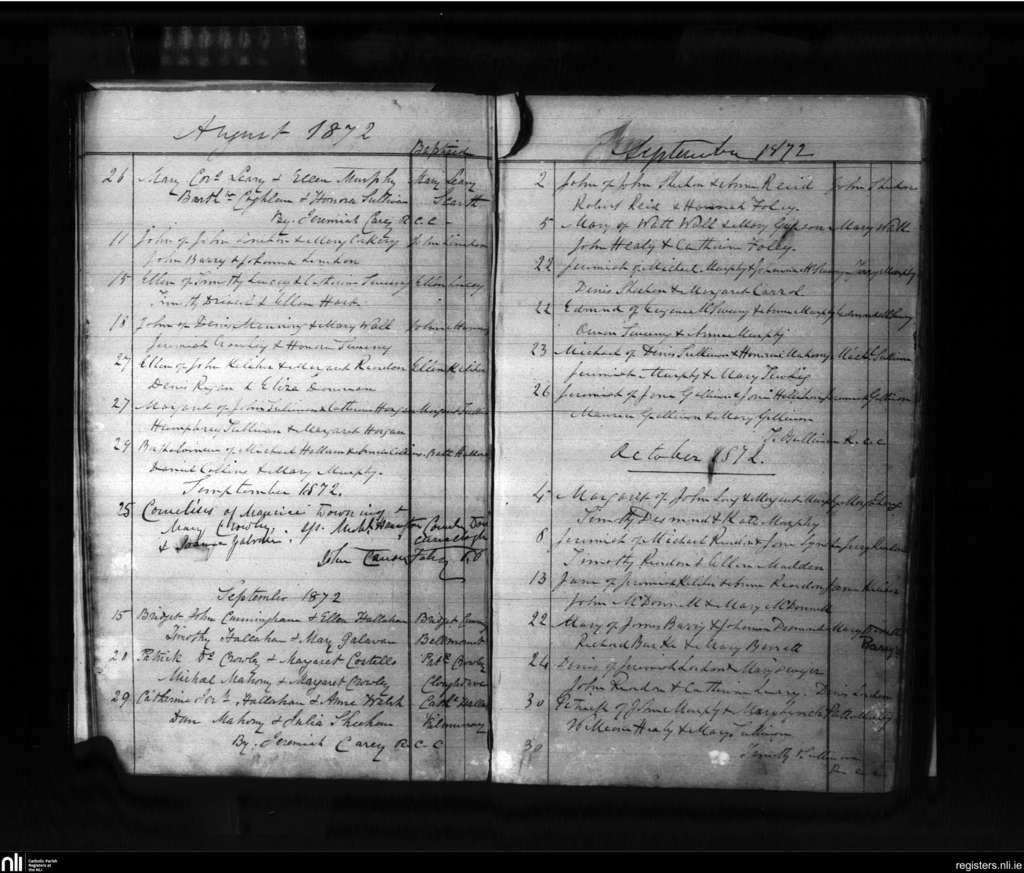 Kilmurry; County of Cork; Diocese of Cork and Ross. Baptisms, Aug. 1872 to Oct. 1872