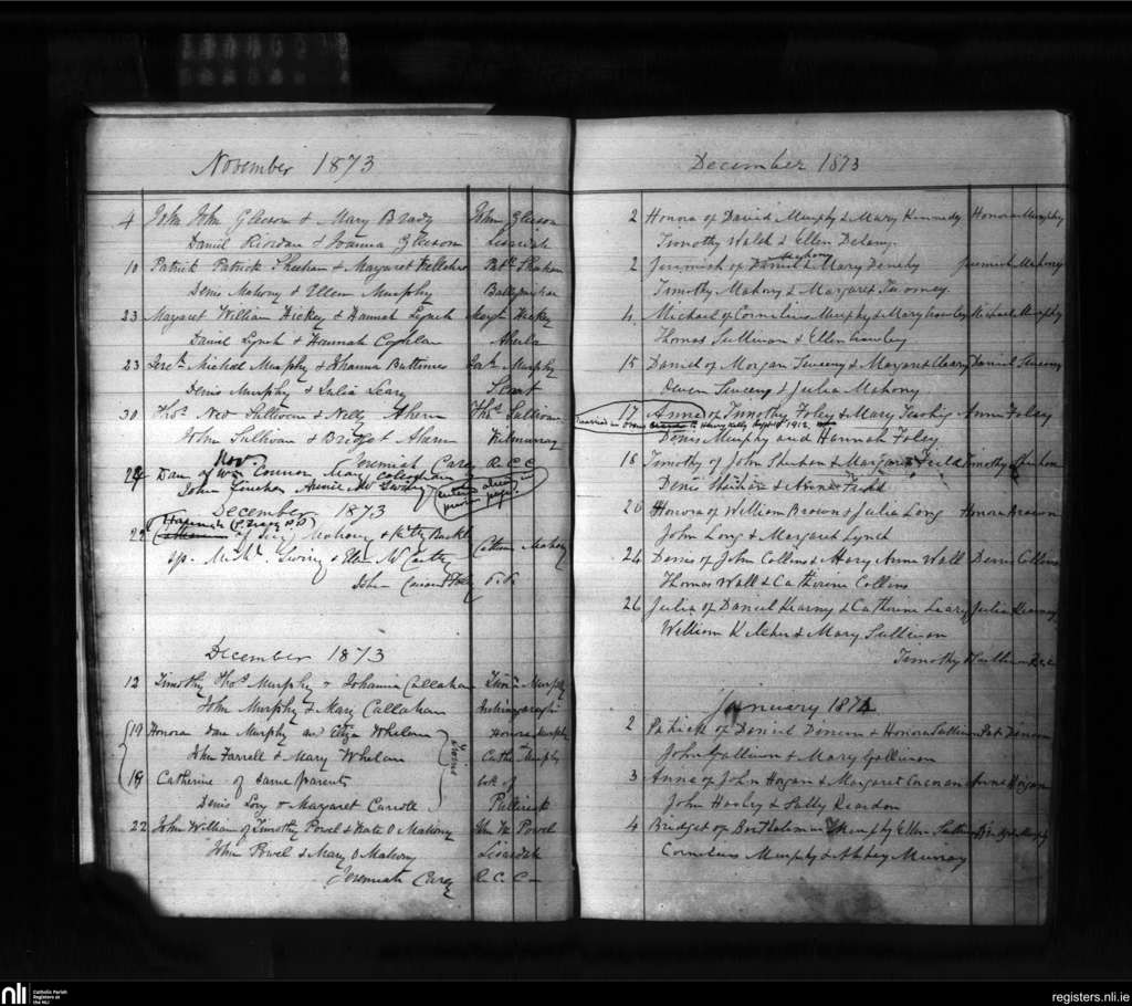 Kilmurry; County of Cork; Diocese of Cork and Ross. Baptisms, Nov. 1873 to Jan. 1874