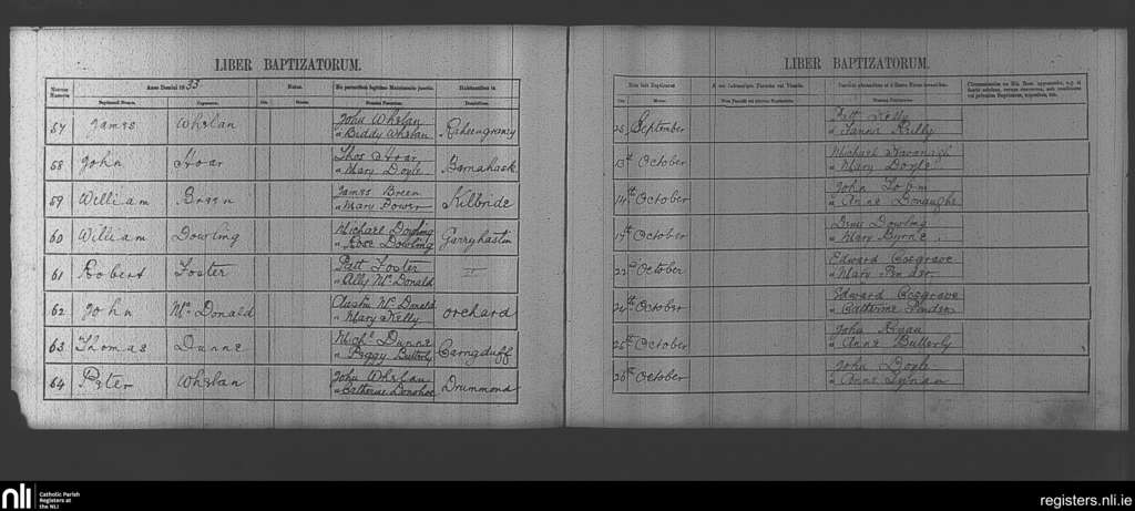 Clonegal; County of Wicklow, Carlow, Wexford; Diocese of Kildare and Leighlin. Baptisms, Sep. 1833 to Oct. 1833