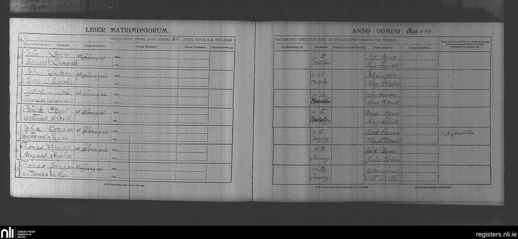 Clonegal; County of Wicklow, Carlow, Wexford; Diocese of Kildare and Leighlin. Marriages, Oct. 1833 to Jan. 1834