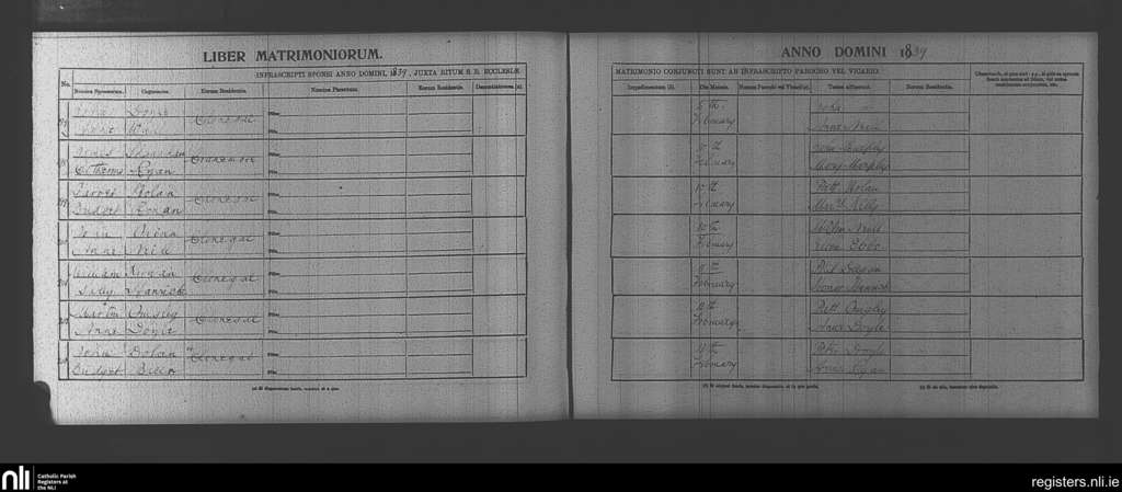 Clonegal; County of Wicklow, Carlow, Wexford; Diocese of Kildare and Leighlin. Marriages, Feb. 1839