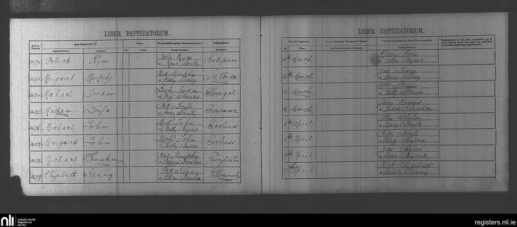 Clonegal; County of Wicklow, Carlow, Wexford; Diocese of Kildare and Leighlin. Baptisms, Mar. 1843 to Apr. 1843