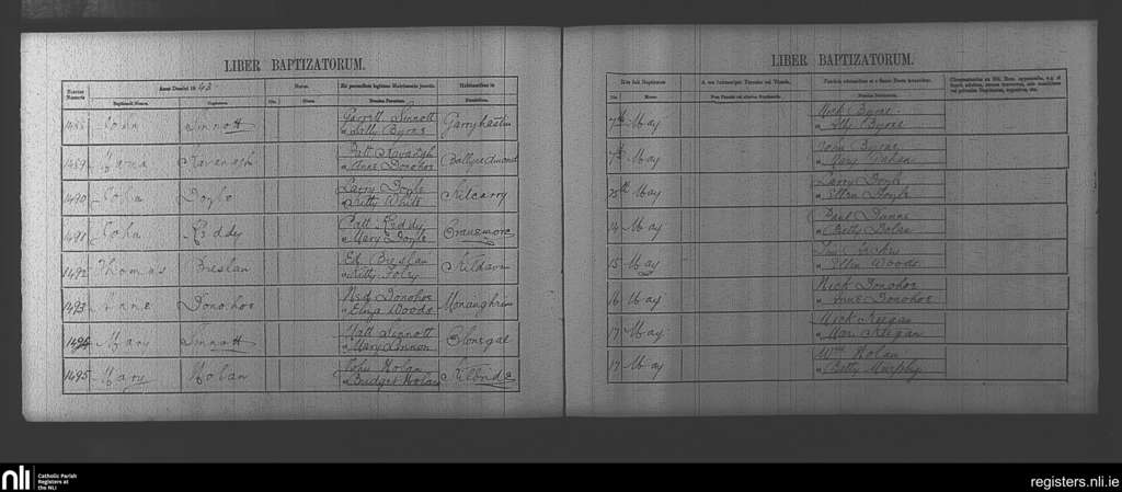 Clonegal; County of Wicklow, Carlow, Wexford; Diocese of Kildare and Leighlin. Baptisms, May 1843
